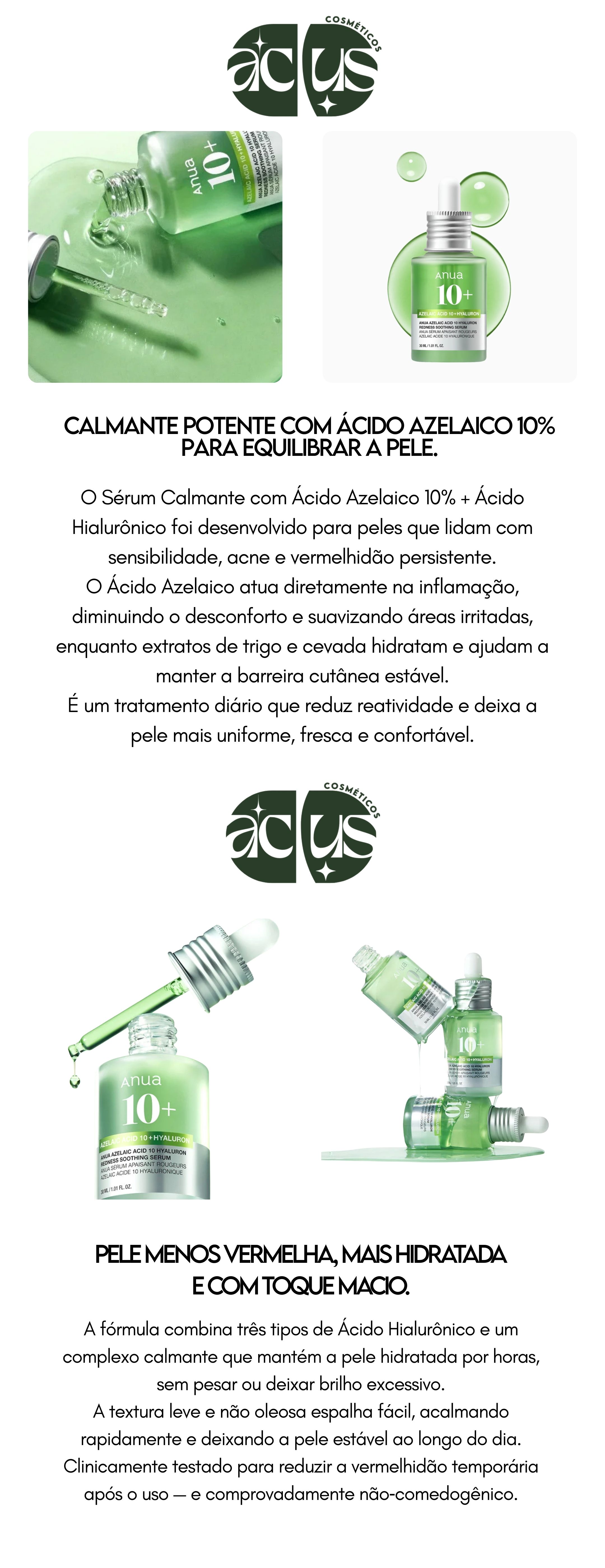 Ácido Azelaico 10% — Suaviza a vermelhidão, uniformiza o tom e controla o excesso de sebo, atuando também como agente antibacteriano suave.